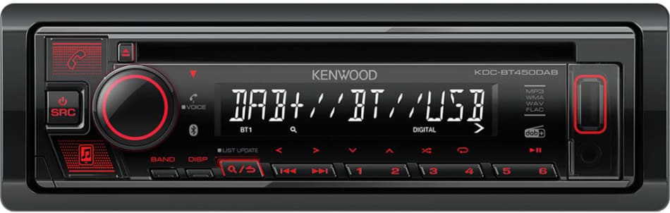 Kenwood KDCBT450DABiPod/iPhone- og Androidkompatibel.Innebygd Bluetooth handsfree med audio streaming.Denne spilleren har langt minne for kjøretøy med hovedstrømsbryter. (Menyinnstilling) CD-receiver med digital radiomottager DAB/ DAB+, iPod/iPhone direkte kontroll og USB-inngang. Få enkel tilgang til din digitale musikksamling via USB. Lytt til musikk fra minnepinnen, harddisken, iPod'en eller nyt det støyfrie mottaket og den gode lyden fra DAB-radioen.USB- og AUX-inngangerMottakeren spiller av alle brente CDer , inkludert plater lastet med MP3, WMA, AAC, WAV.Den praktiske USB-inngangen på fronten er perfekt for bruk med USB-penner. På frontpanelet er det også AUX-inngang som gjør det enkelt å koble til andre lydkilder som for eksempel en MP3 spiller.BluetoothInnebygget bluetooth handsfree. Dette betyr at du kan la telefonen ligge overalt i bilen eller i lomma, og adresser blir automatisk tilgjengelig for å surfe og ringe. i tillegg kan du streame musikken fra mobilen til spilleren. Spesifikasjoner 4x50 W MOSFET DAB+ TA (Traffic announcement, Traffic alarm) Bluetooth HFP/A2DP innebygd (HFP V1.6 & A2DP (aptX)) 5 x Bluetooth-enheter kan kobles til samtidig for lydavspilling 2 x telefoner kan være tilkoblet samtidig for telefonbruk iPod / iPhone kontroll USB og AUX (foran ) 1,5A lading av telefon via USB 13-bånds EQ Multispråkmeny og tekstvisning 1 Linjeutgang (2,5V) Langt minne Inngang for multifunksjonsratt Støtter bruk av smarttelefon som fjernkontroll (Play Store)Vindusantenne inkludert med 3 meter kabel.Separat mikrofon inkludert med 3 meter kabel.